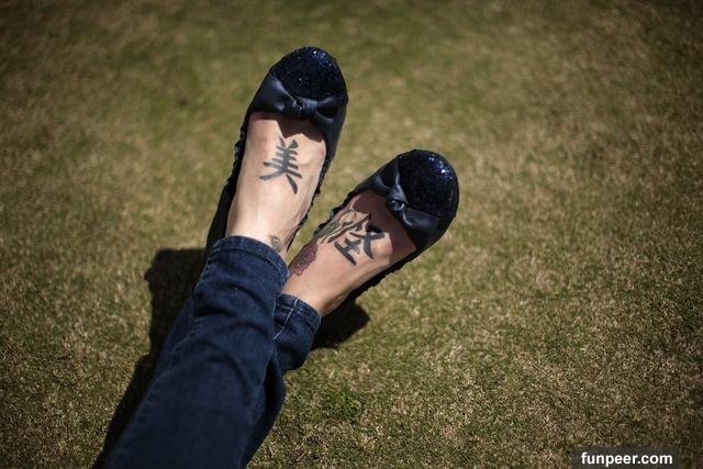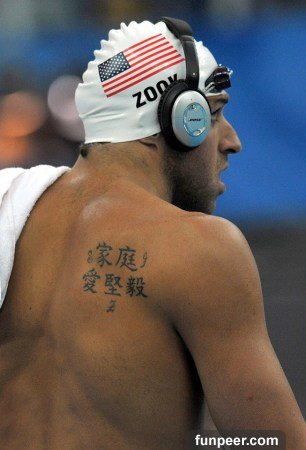 ▼壘球運動員Kim Maher刺的康文止功流到底是什麼意思?不懂!▼Gloria Govan背上刺著「信愛家庭相信」。嗯,這意思也是有點莫名……▼美國泳將Justin Zook的身上刺了「家庭 愛堅毅」。▼一名女性在腳背上刺了「美」跟「怪」,好喔。