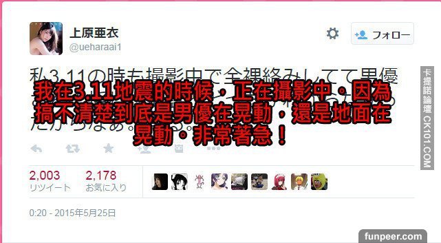 最近人氣AV女優上原亞衣在Twitter講述了自己遭遇9級地震時超恐怖經歷: